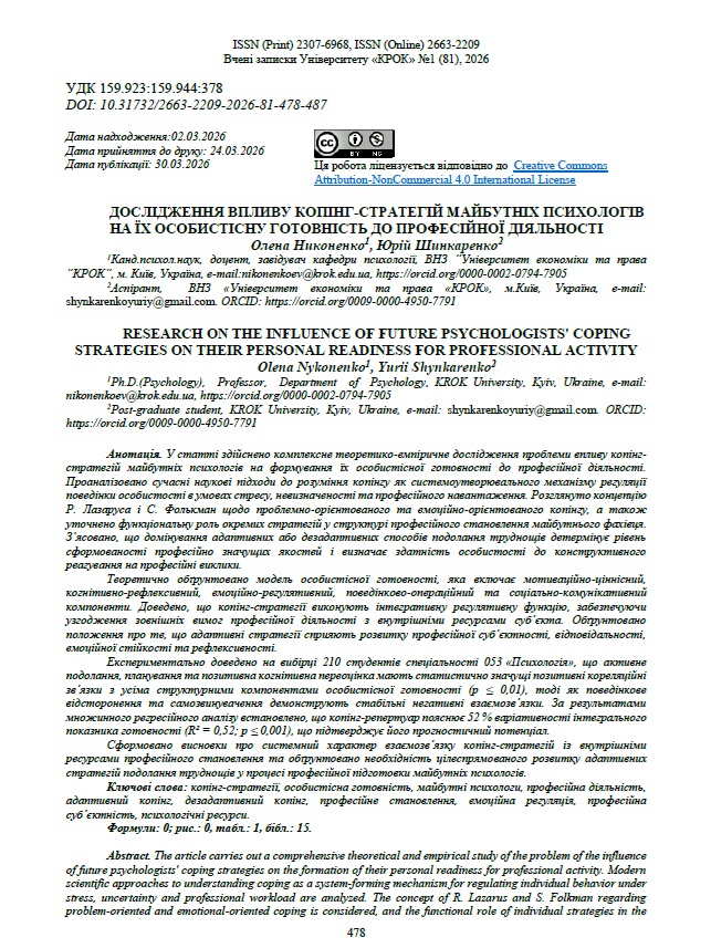 копінг-стратегії, особистісна готовність, майбутні психологи, професійна діяльність, адаптивний копінг, дезадаптивний копінг, професійне становлення, емоційна регуляція, професійна суб’єктність, психологічні ресурсиАнотація